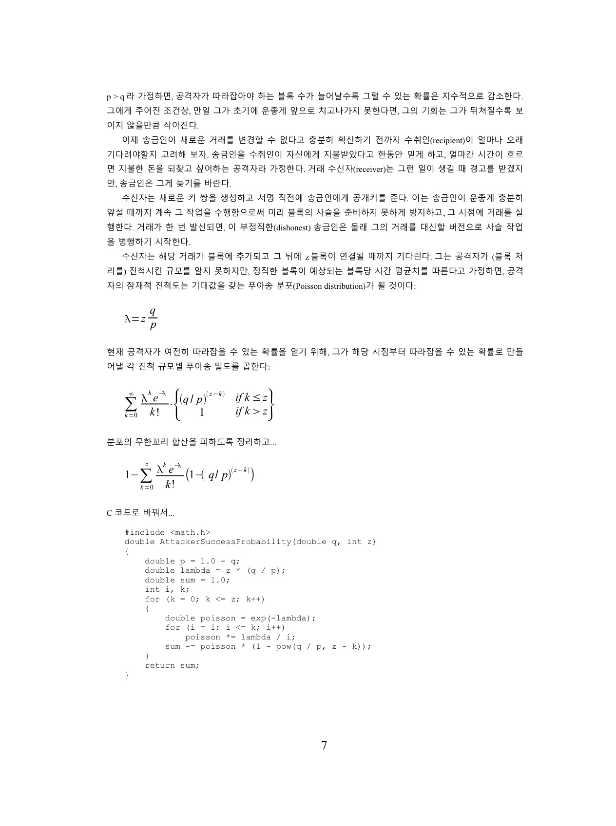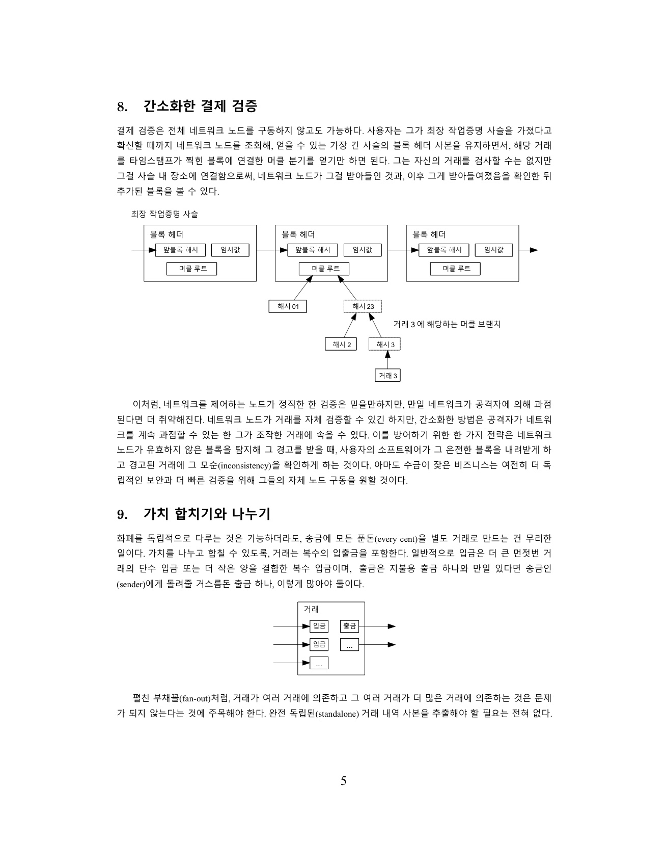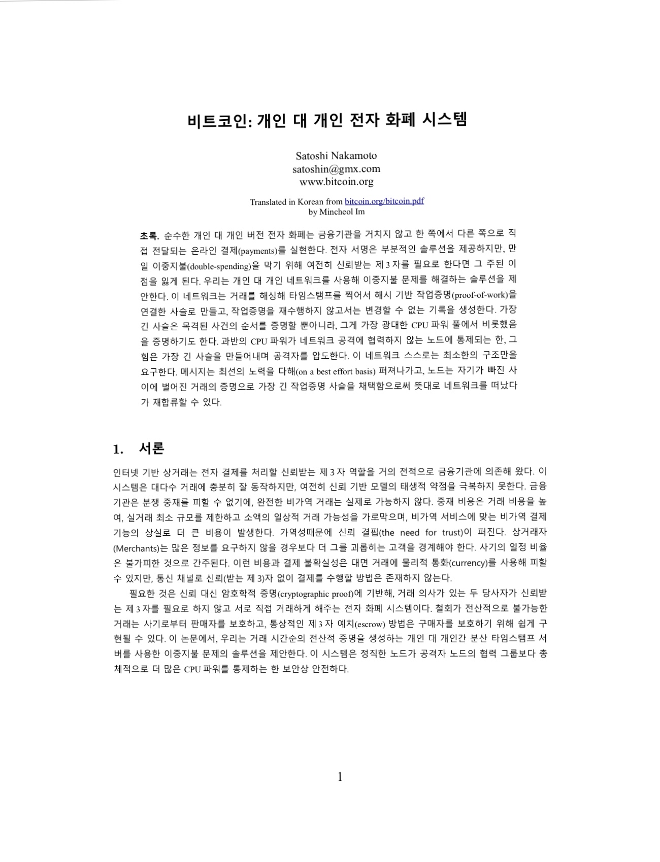 필요한 것은 신뢰 대신 암호학적 증명(cryptographic proof)에 기반해, 거래 의사가 있는 두 당사자가 신뢰받 는 제3자를 필요로 하지 않고 서로 직접 거래하게 해주는 전자 화폐 시스템이다. 철회가 전산적으로 불가능한 거래는 사기로부터 판매자를 보호하고, 통상적인 제 3 자 예치(escrow) 방법은 구매자를 보호하기 위해 쉽게 구 현될 수 있다.이 논문에서,우리는 거래 시간순의 전산적 증명을 생성하는 개인 대 개인간 분산 타임스탬프 서 버를 사용한 이중지불 문제의 솔루션을 제안한다. 이 시스템은 정직한 노드가 공격자 노드의 협력 그룹보다 총 체적으로 더 많은 CPU 파워를 통제하는 한 보안상 안전하다.